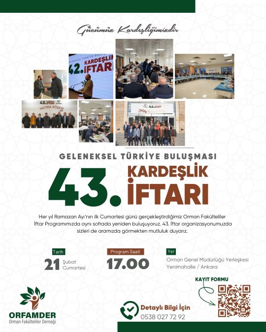 Orman Fakülteliler Derneği (ORFAMDER), 43. Geleneksel İftar Programı Ankara’da yapıldı. Türkiye’nin farklı illerinden gelen meslektaşların katılımıyla gerçekleşen iftarda; kardeşlik hukuku, mesleki dayanışma ve yaklaşan seçimlerle ilgili meslek kamuoyuna mesajlar verildi.